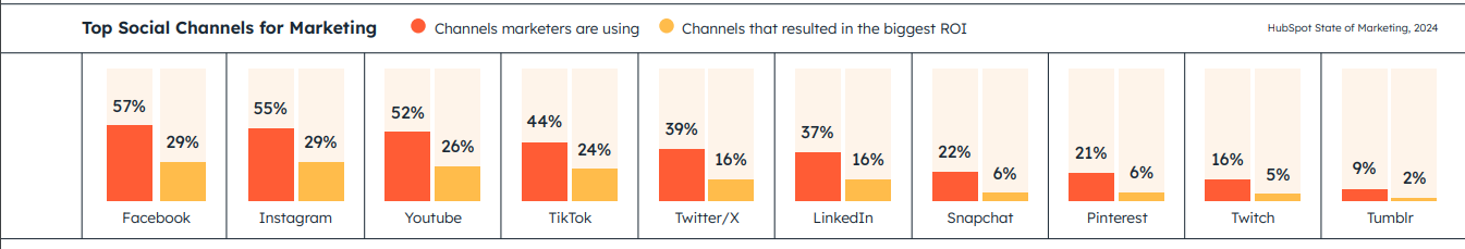 Every marketer knows no matter how many times your client tells you they’re interested in awareness or full-funnel marketing, they’re actually interested in driving ROAS or ROI for their brand. When looking at key digital channels in HubSpot’s 2024 State of Marketing report, we can see that Meta platforms Facebook and Instagram are not only the most used but also are noted as yielding the highest return. With a continued focus on video creative & UGC (user-generated content), video entertainment giants, YouTube and TikTok, aren’t too far behind.