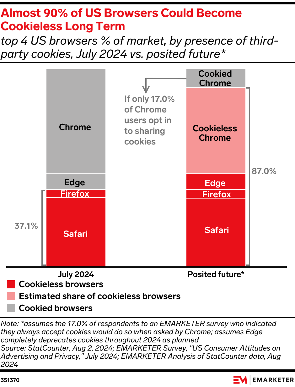 - High Cookieless Future: Up to 87% of US browsers could go cookieless, reducing third-party tracking.