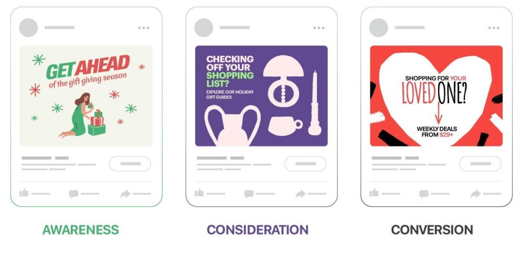 Advertisers are able to utilize the months ahead of the holiday season to plan for a seamless curbside pickup model. Incorporating BOPIS messaging in all campaign funnels ensures a seamless transition from awareness to consideration and finally, conversion – as seen below.