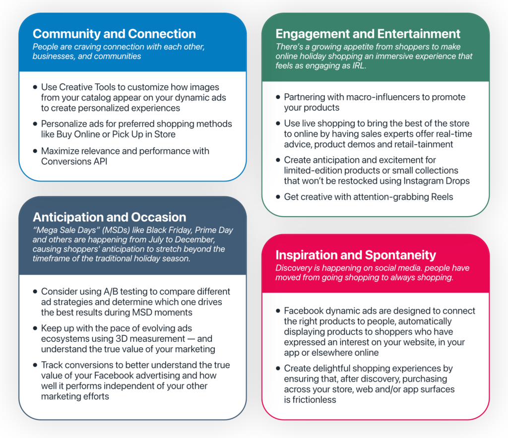 According to Facebook’s holiday guide, the central focus for businesses this season should be to “help your products find the right people.” They have discovered that the top 4 needs of Holiday shoppers affect the way people shop and buy. They are: