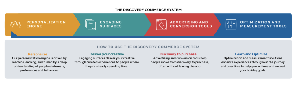 In response to these needs, Facebook developed the “Facebook Discovery Commerce” function. The system comprises several sophisticated components and tools whose goal is to help businesses anticipate Shopper’s needs.