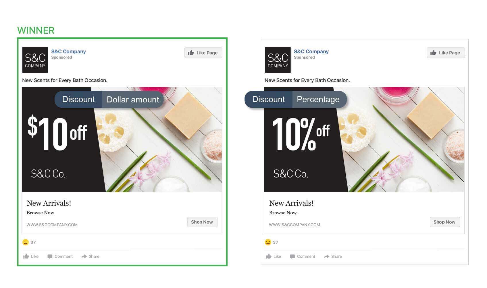 - Ads with “X dollars off” delivered 28% higher return on ad spend than ads with “X percent off”